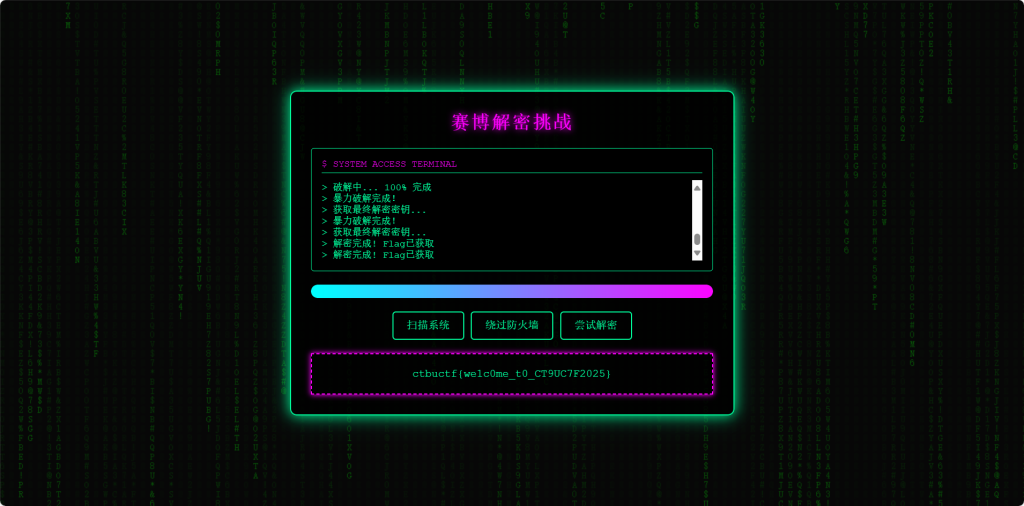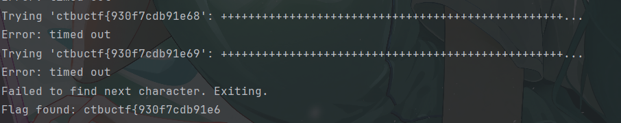 例如,如果输入ctbuctf{x},因为交互效果的原因,当花括号中的第一位内容真的是x时,响应中的Decrypting...部分,会输出成ctbuctf{x},然后抛出错误,如果不是x,只会输出成ctbuctf{x 然后抛出错误
