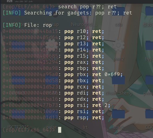 $ ROPgadget --binary ./rop | grep "syscall" 0x00000000004011fc : syscall$ ROPgadget --binary ./rop | grep "pop rdi"0x0000000000400686 : pop rdi ; ret后面的大致都差不多的找法,常规的gadget而已